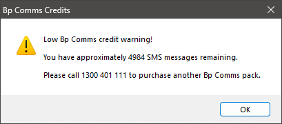 A prompt similar to below will display when your Bp Comms credit falls below the configured limit.
