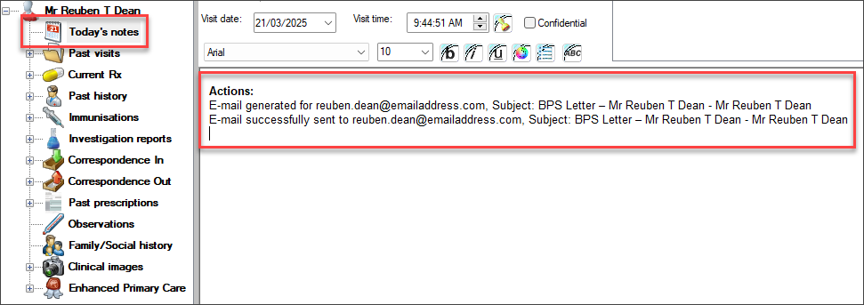 When emails are sent from Correspondence In in the patient record, an Action will be created in Today's notes to indicate that an email has been generated and successfully sent.