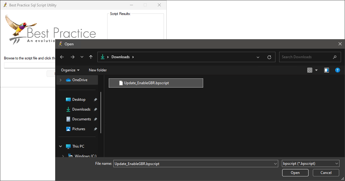 - Click the ... button to open a file explorer. Browse to the Update_EnableGBR.bpscript file saved in step 2.