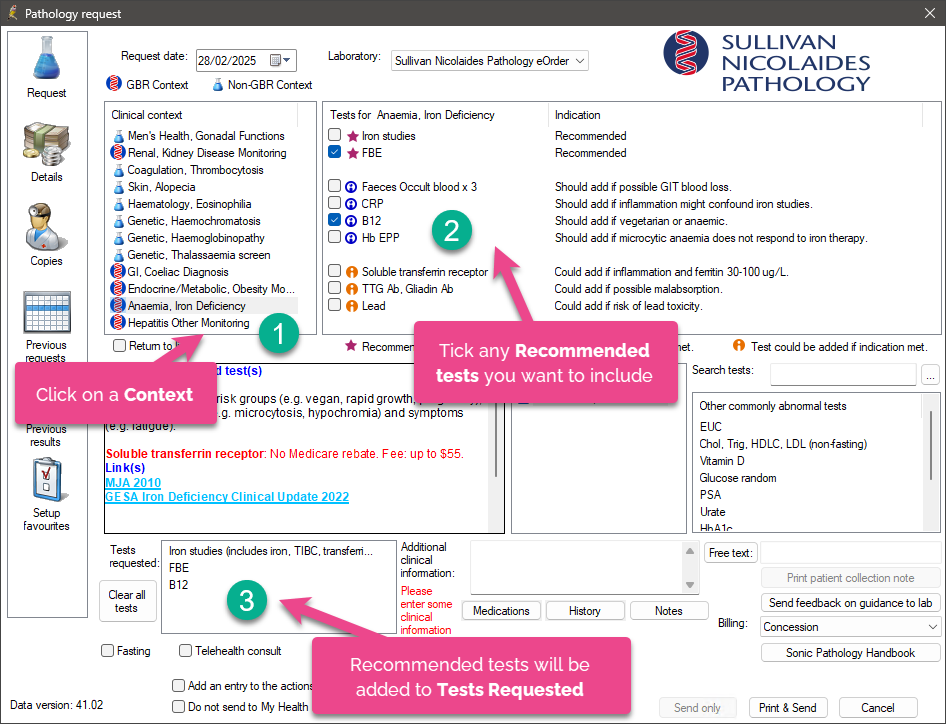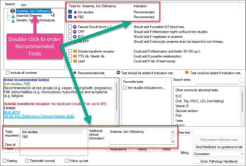 - Double click on a Context to order Recommended Test/s and populate Additional clinical information.