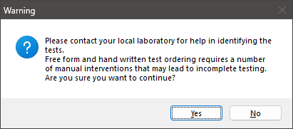 Bp Premier will prompt you to confirm with the intended laboratory the test you are adding. Free text requests may not always be interpreted correctly by a laboratory, or the test may not be available.