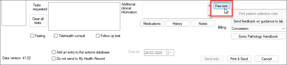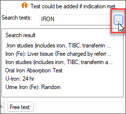 Use the Free text box located in the lower right corner of the screen to enter tests that are not available under Clinical Context, Abnormal tests, or Favourites.