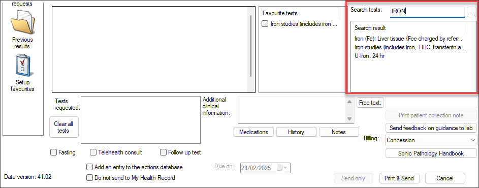 . The Pathology Request screen will appear. - Add a test from your Favourites tests list.