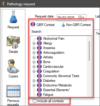 . The Pathology Request screen will appear. - Contexts will be pre-filtered using the patient's demographic information. To display all contexts and ignore demographic filtering, tick Include all contexts.