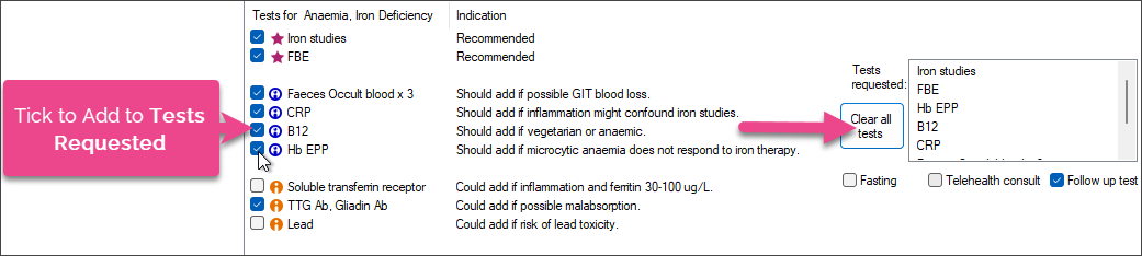 - Review the recommended tests and tick any tests that should be added to the Tests Requested list.