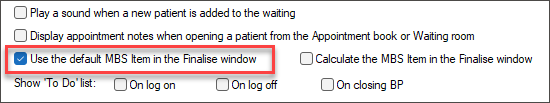 - Ensure that the provider you wish to enable a default MBS item for is selected in the User name: field, and tick Calculate the MBS item in the Finalise window.