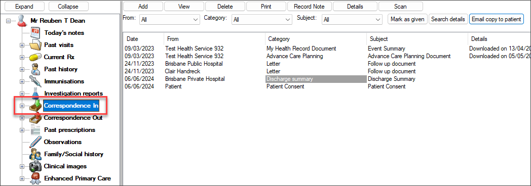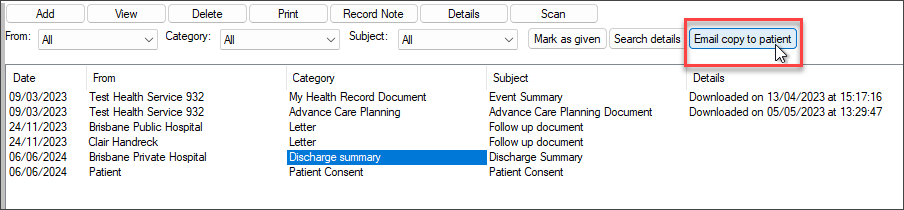 NOTE Only one item of Correspondence can be emailed to the patient at a time.