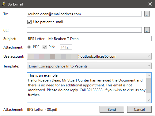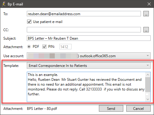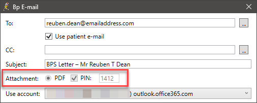 - The Use account menu indicates the outgoing or 'from' email address. If you have a user email address set up in Bp Premier, it will appear in this menu. The practice email address will appear if you do not have a user email address set up in Bp Premier.