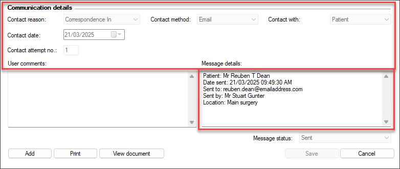 The Contact Note will be dated to align with the date of the email, with the Contact Reason set as Result and the Contact Method set as Email. The Message Details section includes: