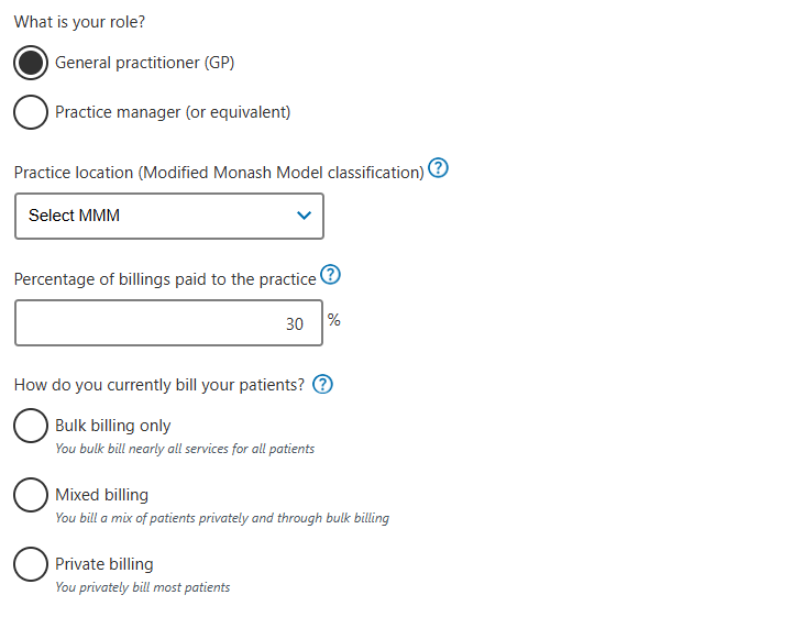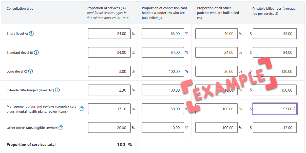 For a more accurate estimate, amend any pre-filled average proportion of service types, bulk billing rates, and average privately billed fees to match your real activity per year.