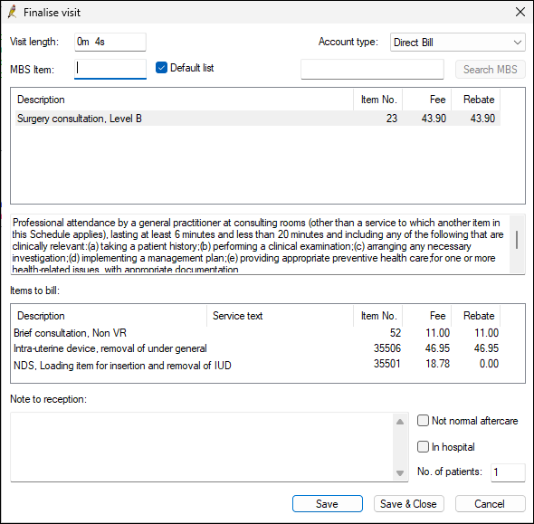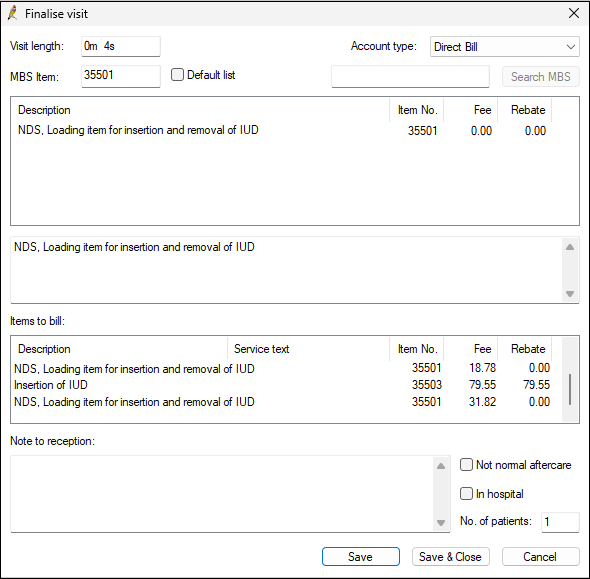For the loading item to be payable, the patient cannot be charged any out-of-pocket costs for any MBS items claimed in the LARC insertion or removal appointment, including any co-claimed items relating to provision of the LARC service.