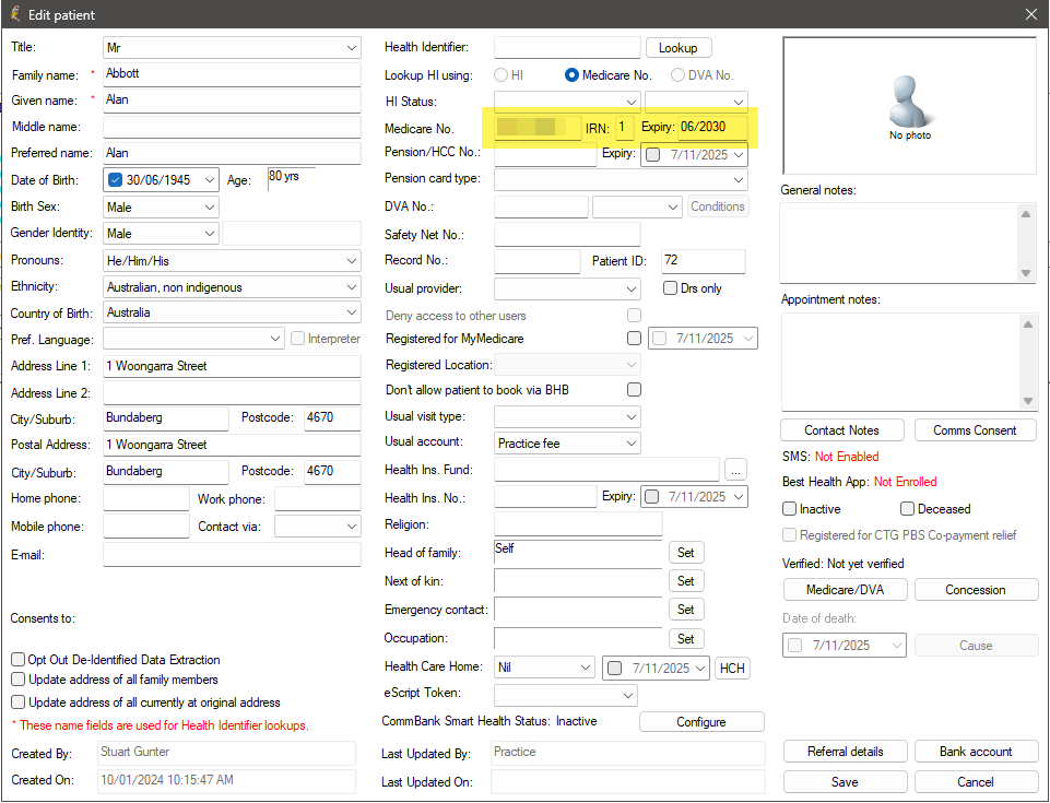 - To update a patient's details, click Update. The Online Patient Verification screen will appear. Update the values of the items you want to update and click OK. In the example shown below, the patients Medicare card details needed to be updated from the patient demographics.